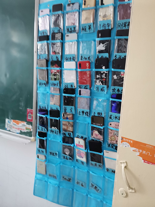 与以往不同,同学们踏进教室时,自觉将手机打成振动模式或关机,放入教室门口墙上的手机袋中,确保上课专心听讲。