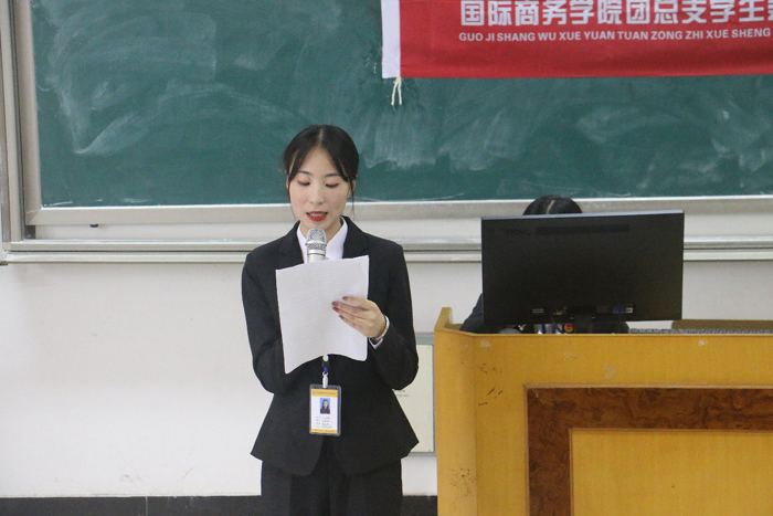 9月23日下午,国际商务学院团总支第二届换届大会在3201教室举行,校团委书记司斌斌书记,校团委周莹老师,国际商务学院党支部书记汪慧书记,国际商务学院学工助理黄吉胜老师、辅导员吕欣欣老师及各分院学生会,大学生记者团,校卫队,社团联合会以及国际商务学院各班级同学参加了此次大会。