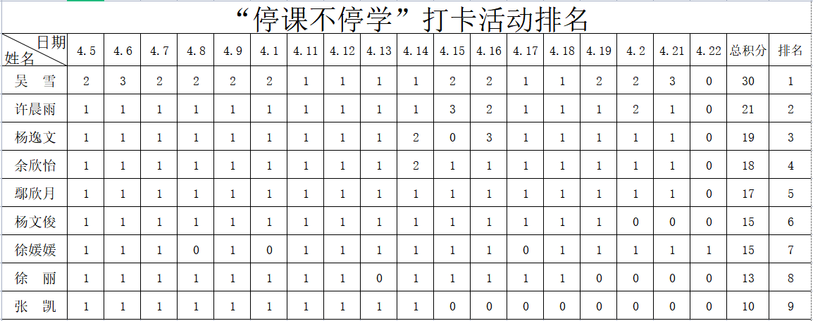 本次班级健康打卡活动吴雪、许晨雨获得一等奖,杨逸文、余欣怡、鄢欣月获得二等奖,杨文俊、徐媛媛、徐丽、张凯获得三等奖。