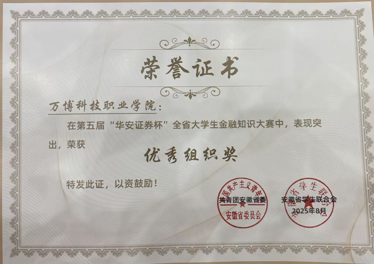 近日,团省委、省学联联合华安证券股份有限公司共同举办的第五届“华安证券杯”安徽省大学生金融知识大赛顺利落下帷幕。本届大赛自启动以来,吸引了全省多所高校的积极参与,凭借出色的组织动员能力与参赛队伍的优异表现,我校荣获“优秀组织奖”。