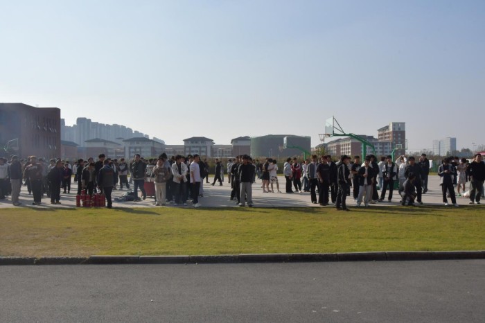 短时间内,所有参演学生均安全撤离至指定安全区域。集结完毕后,各班辅导员迅速组织参演学生在操场以班级为单位列队集合,维持现场秩序,确保后续环节顺利进行。