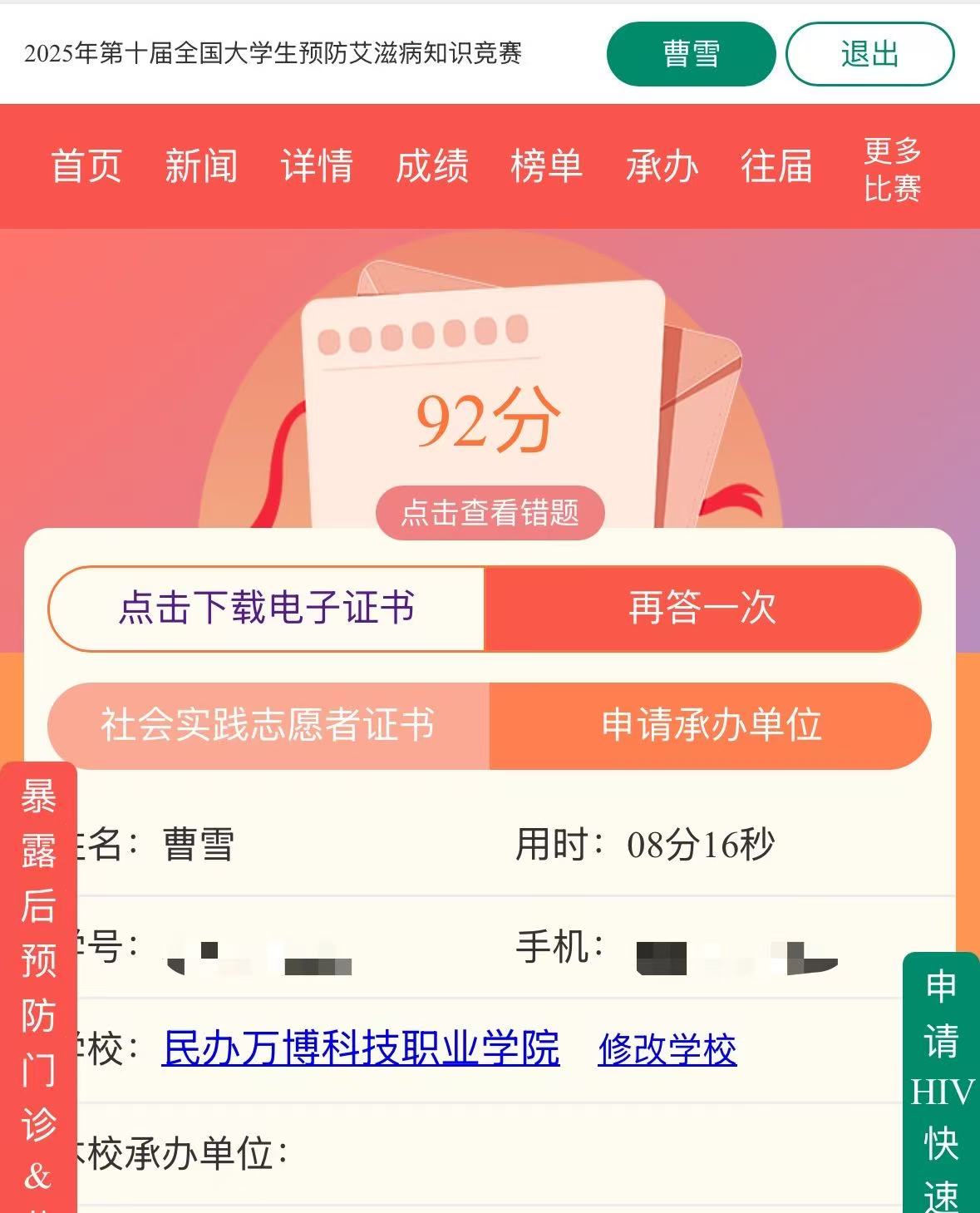 现场,志愿者们提前布置好防艾宣传手册、科普海报与互动道具。他们主动向往来同学发放宣传单页,并以生动易懂的语言耐心讲解,在传递知识的同时,传递对生命的尊重与关怀。“防艾知识问答”区气氛热烈,同学们在问答中巩固知识、澄清误区。答对者获得定制徽章、钥匙扣等奖品,笑容中洋溢着学习的收获。此外,志愿者们在线上组织学生参加第十届全国大学生预防艾滋病知识竞赛。