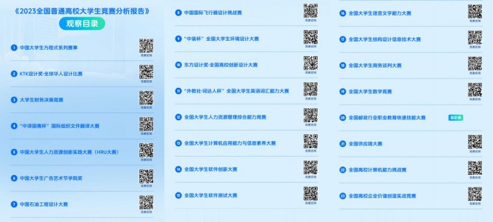 本次发布的目录涵盖84项全国大学生学科竞赛及34项观察目录。该目录依据中国高等教育学会高校竞赛评估与管理体系研究专家工作组于2024年3月22日发布的《2023全国普通高校大学生竞赛分析报告》整理而成。报告同时公布了普通本科院校大学生竞赛榜单13个、高职院校大学生竞赛榜单11个及省份大学生竞赛榜单3个。